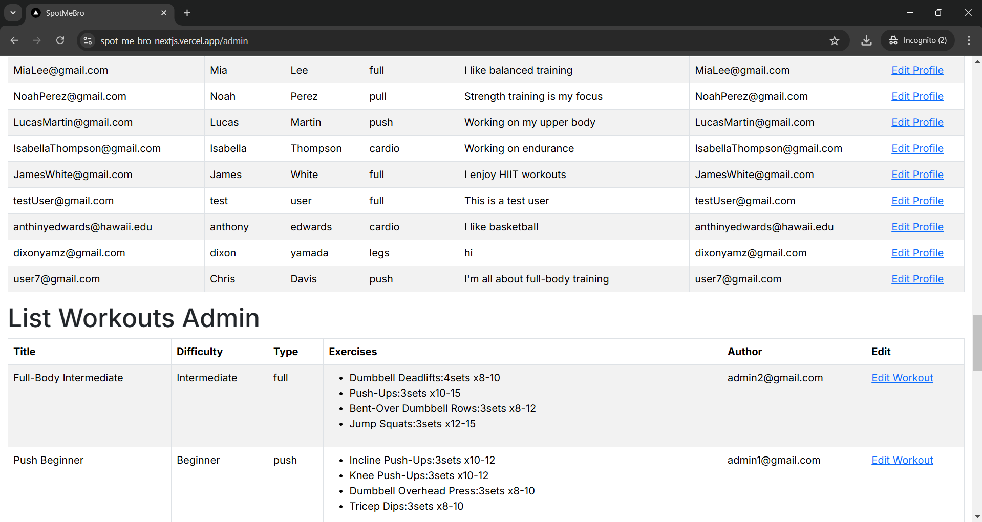 Here is the admin page where admins can edit profiles and workouts: