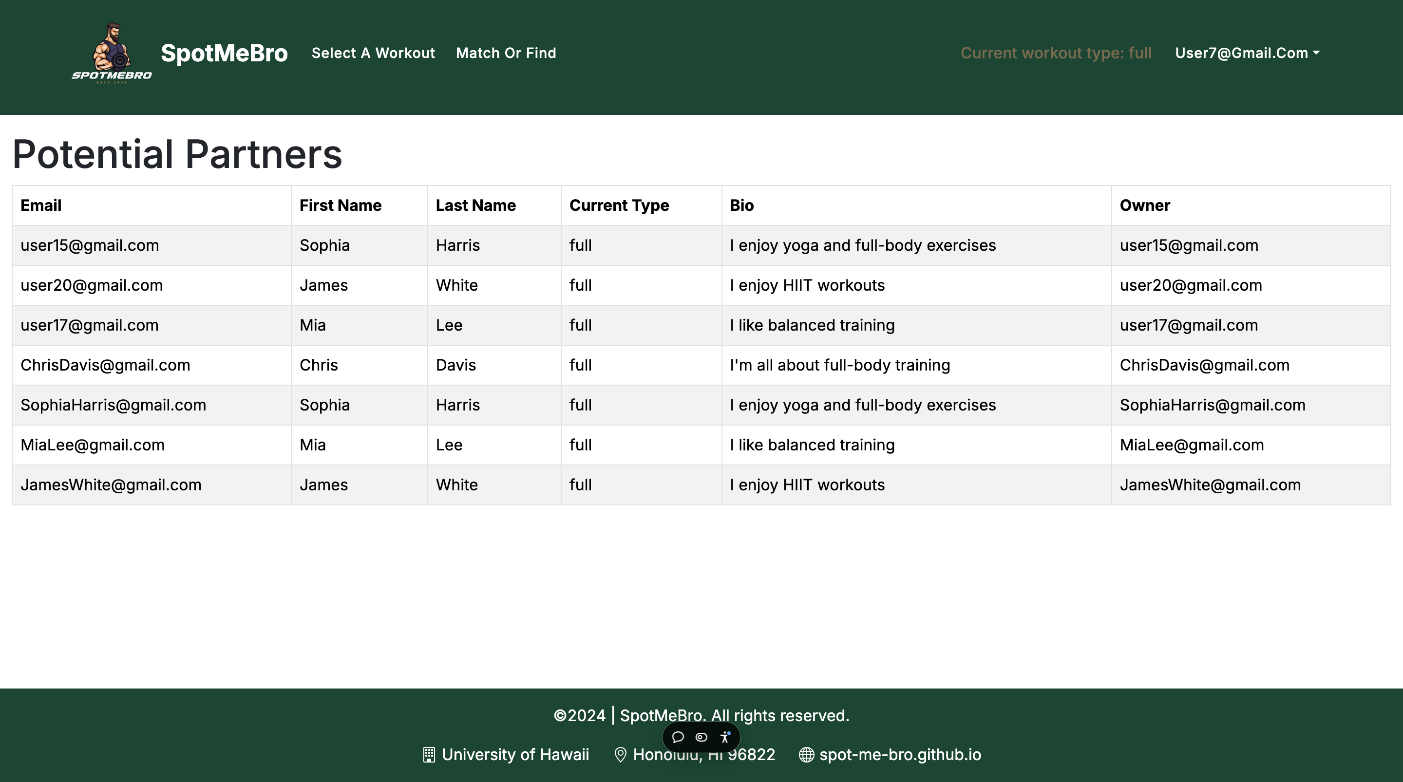 Here is the list partners page, once a user has logged in and selected a type of workout they get presented with other users who have the same type in their profile: